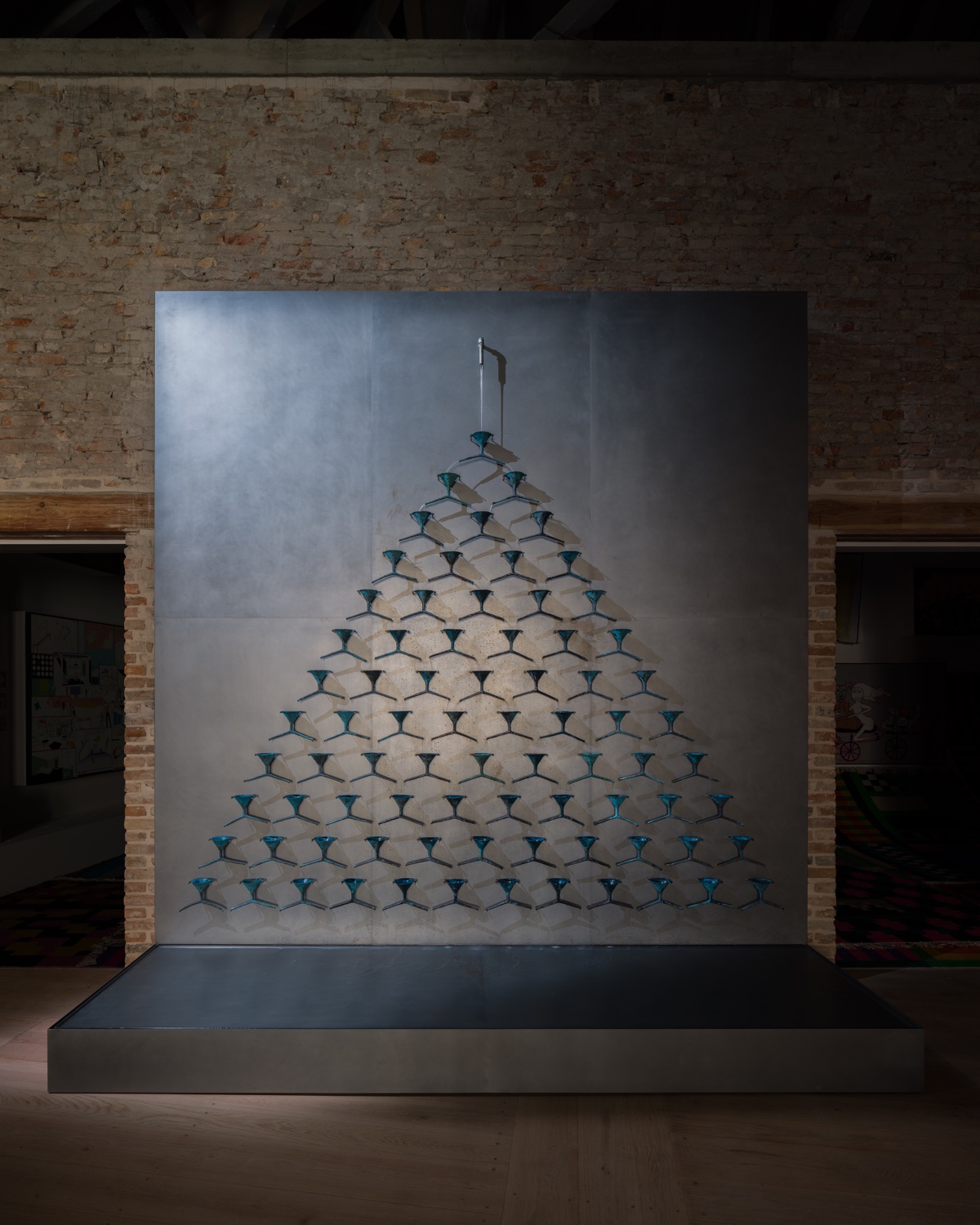 Fountain of Exhaustion. Acqua Alta is an exhibition project. It presents a new 3.5-meter (10 ft) version of Pavlo Makov's fountain and reveals its 27-year history through archival materials. Fountain of exhaustion is an object consisting of a system of funnels, each of which has two exits and splits the water flow into two. Arranged one under the others, 12 rows of funnels direct the water from top to bottom, so that the water flow gradually diminishes. Unlike spurting fountains, the Makov's Fountain is exhausting itself.